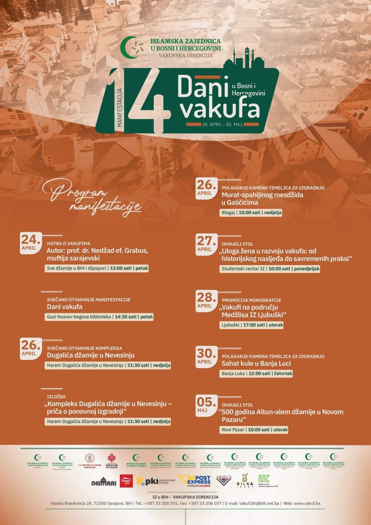 Vakufska direkcija Islamske zajednice u Bosni i Hercegovini organizira 14. po redu manifestaciju pod nazivom “Dani vakufa u Bosni i Hercegovini”. Kroz različite programe Vakufska direkcija podsjeća na vjerske temelje i važnost vakufa, njegove praktične oblike djelovanja te izražava zahvalnost pojedincima i ustanovama koji su svojim doprinosom afirmirali i unaprijedili vakuf kao zajedničko dobro svih muslimana u Bosni i Hercegovini. Ovo je manifestacija koja povezuje vakife i osnažuje naše zajedništvo širom domovine i svih džemata izvan Bosne i Hercegovine. Allah, dž.š., u suri Ez-Zarijat kaže: » I opominji, jer, uistinu, opomena vjernicima koristi!« (Ez-Zarijat, 55) Kroz programe „Dana vakufa“ prepoznajemo živu vjeru i znakove odgovornosti u našoj zajednici, među kojima se posebno izdvajaju ljudi dobra koji razumiju važnost vakufa u životu muslimana.