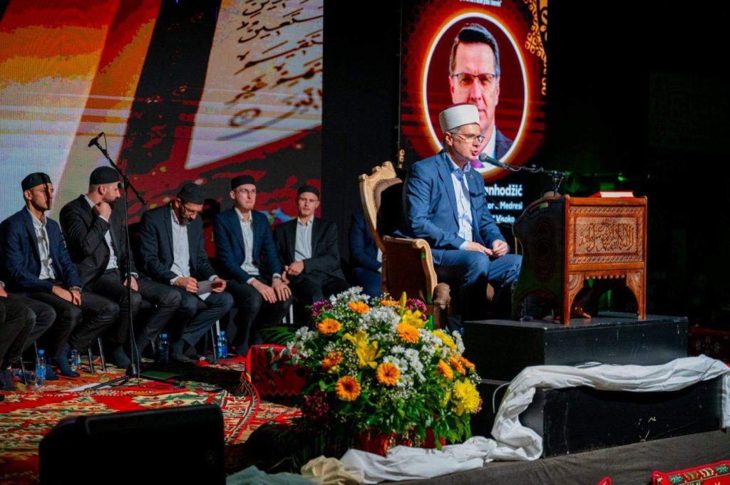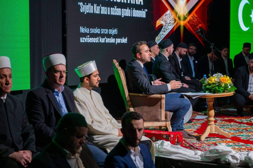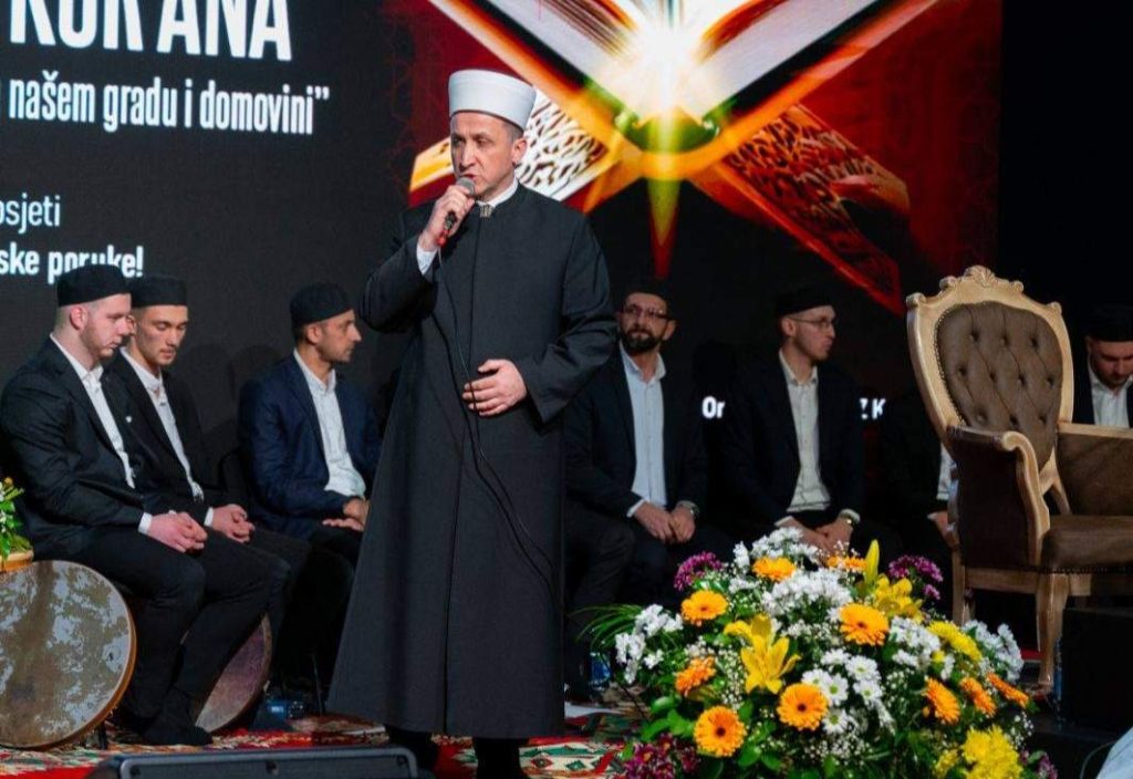 – Večeras vidimo da se Kur’an sluša s mnogo važnosti, ljubavi i posvećenosti. Pitam vas ima li na dunjaluku nešto slično da nam toliko pažnje izaziva? Jesmo li svjesni šta se tu sada dešava s nama? Jesmo li svjesni Allahove milosti koja se spušta na nas dok slušamo i učimo Kur’an. On se obraća i našem razumu i srcu – poručio je dekan Hasani.